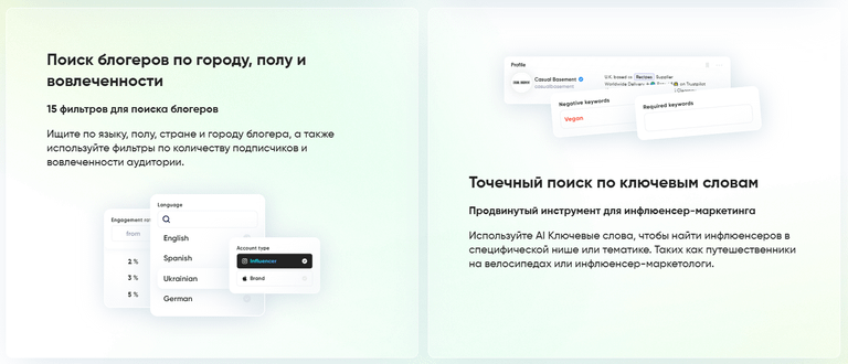 - находить похожие аккаунты: система предоставляет список профилей, на которые подписана аудитория выбранного инфлюенсера;