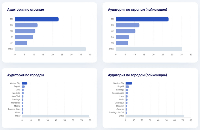 В нижней части отчёта отображаются подробные графики, позволяющие глубже проанализировать аудиторию: её ГЕО, пол и тип.