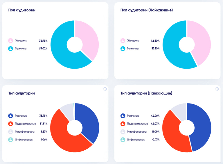 - «Тип аудитории (качественная аудитория)» — помогает определить, какая часть подписчиков является реальной, а какая — накрученной.